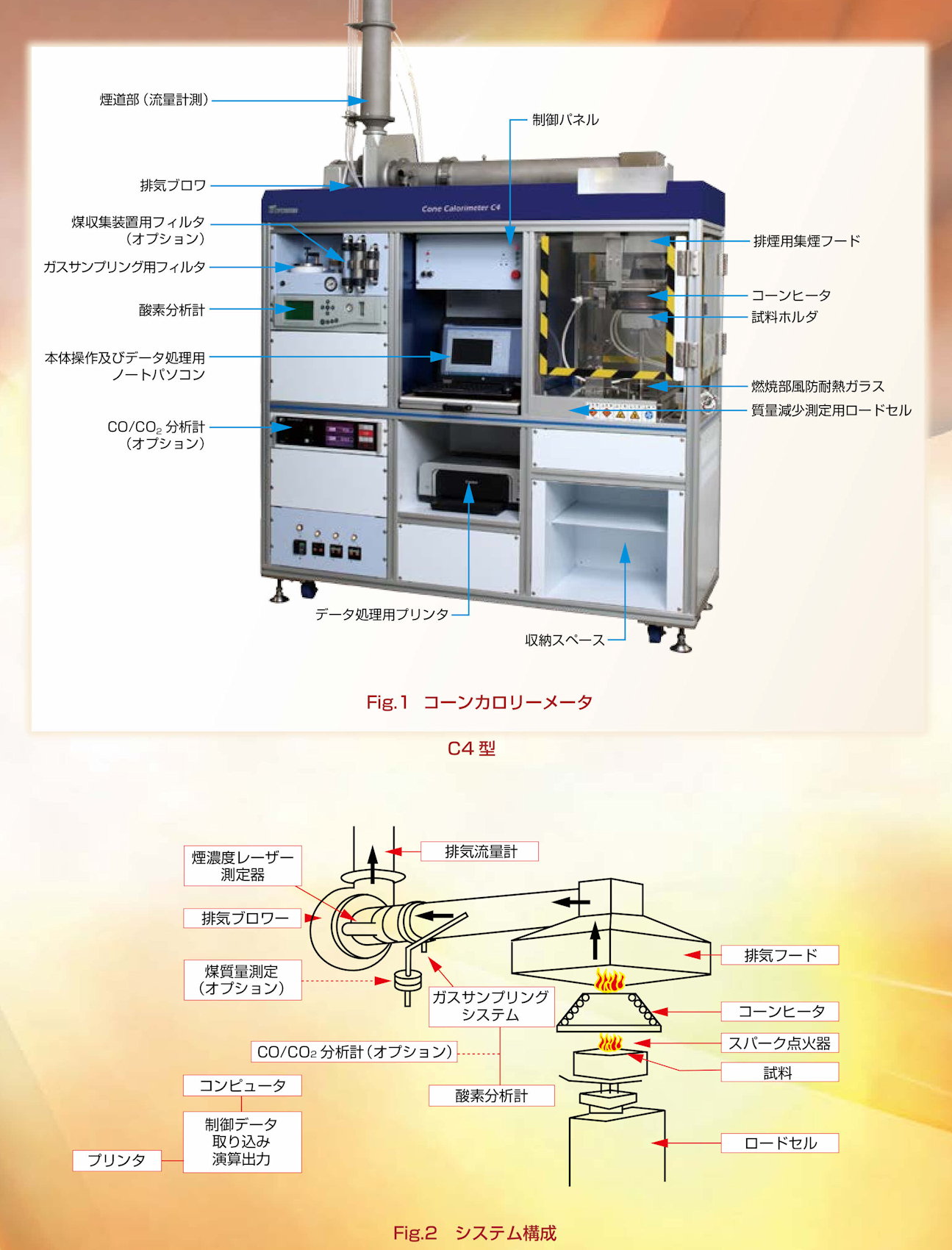 コーンカロリーメータは、有機材料の燃焼において「発生熱量と消費酸素の量が一定(酸素1kgあたり13.1MJ)」という理論に基づいた酸素消費量測定法により、発熱速度・発熱量などを測定する試験機で、建築基準法に基づく防火材料の性能評価に用いられています。