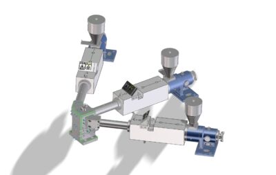 本体・押出機を3台使用することで最大2種3層フィルムまで作成可能です。
